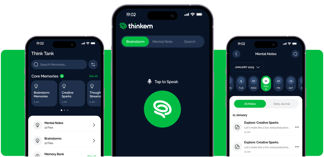 - Capture: Got an idea? Dump it into Thinkem. Text, voice, sketches—it’s all fair game.